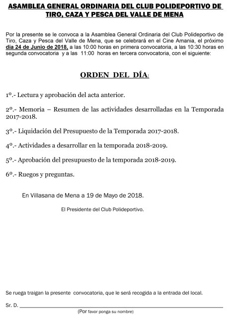 La asamblea del Club será el domingo 24 de este mes de junio » Por la presente se le convoca a la Asamblea General Ordinaria de
