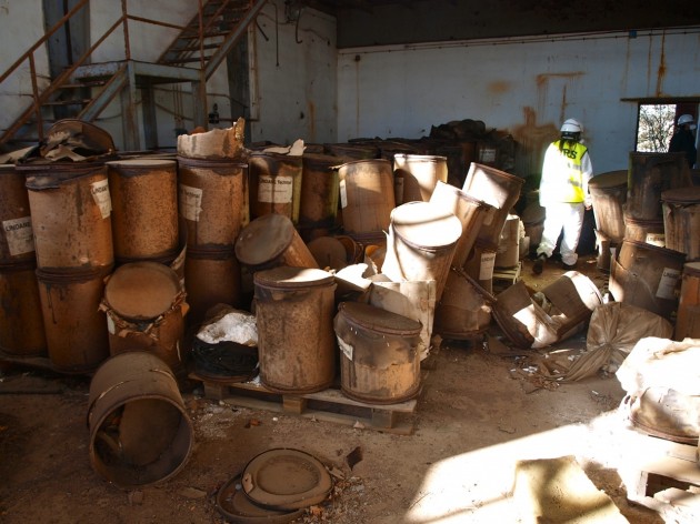Un técnico examina la fábrica abandonada de Inquinosa en Sabiñánigo / Jesús Fernández (esmateria.com)