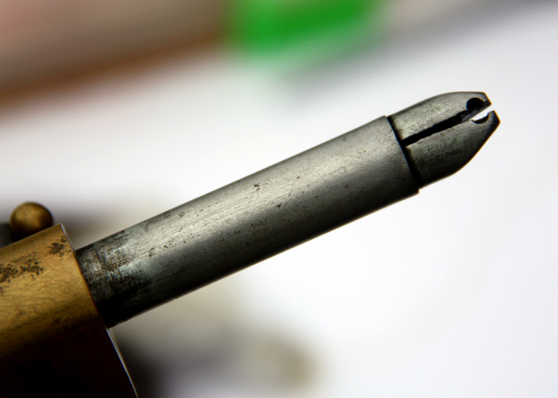 1.- Para que el final del cuerpo de la mosca en la zona próxima a la cabeza quede bien rematado –con el ángulo correcto– es conveniente taladrar el torno, de manera que sea posible sujetar el anzuelo por la parte de la anilla o de la paleta