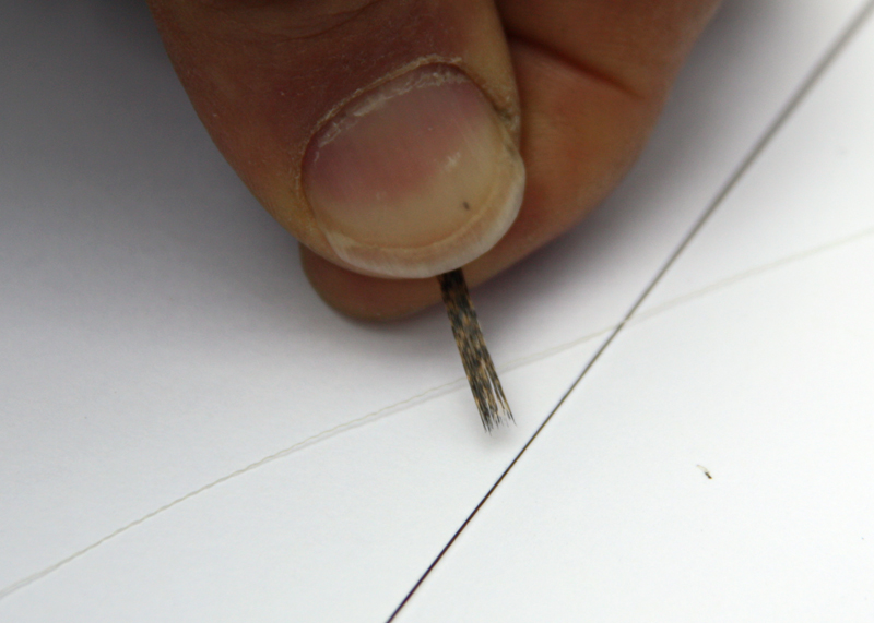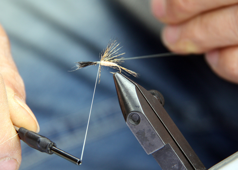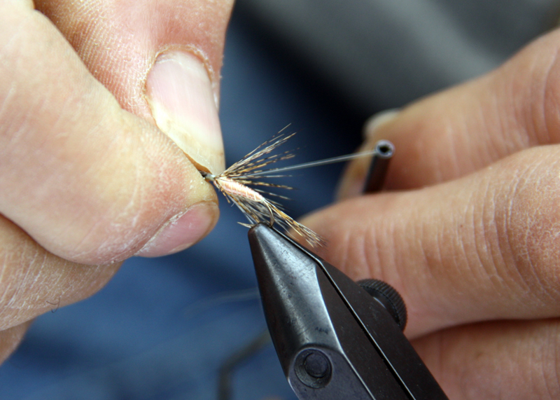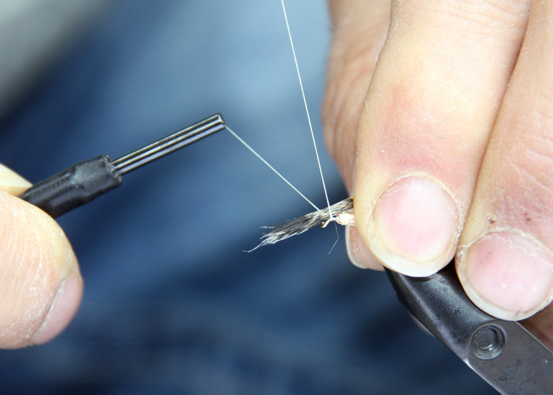 13.- Presentamos las fibras sobre el anzuelo, siempre teniendo en cuenta antes que quedarán con la longitud correcta. Fijamos la pluma con un hilo fino y fuerte, y del tono adecuado, con el que remataremos la cabeza de la mosca. El montador utiliza sus dientes para sujetar el hilo, aunque también es posible fijarlo en la tija mediante un par de vueltas antes de presentar la pluma