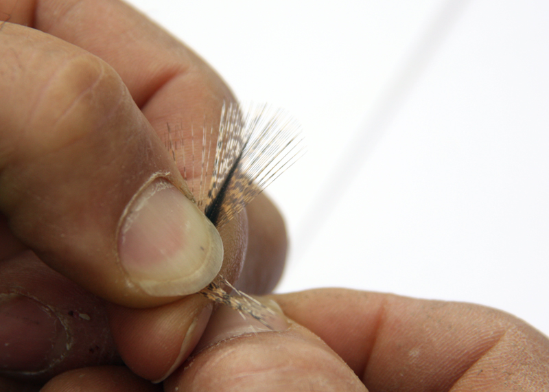 11.- Seleccionamos la pluma adecuada para el collar de la mosca y desechamos aquellas fibras de la parte inferior de la pluma que no sirven por carecer de suficiente obra