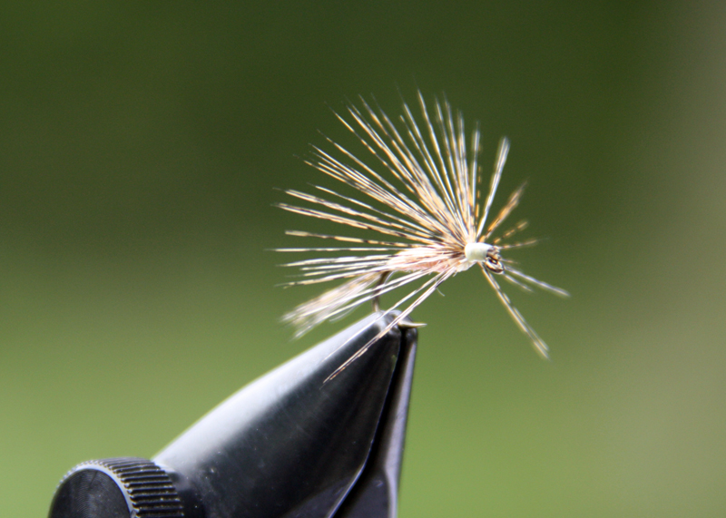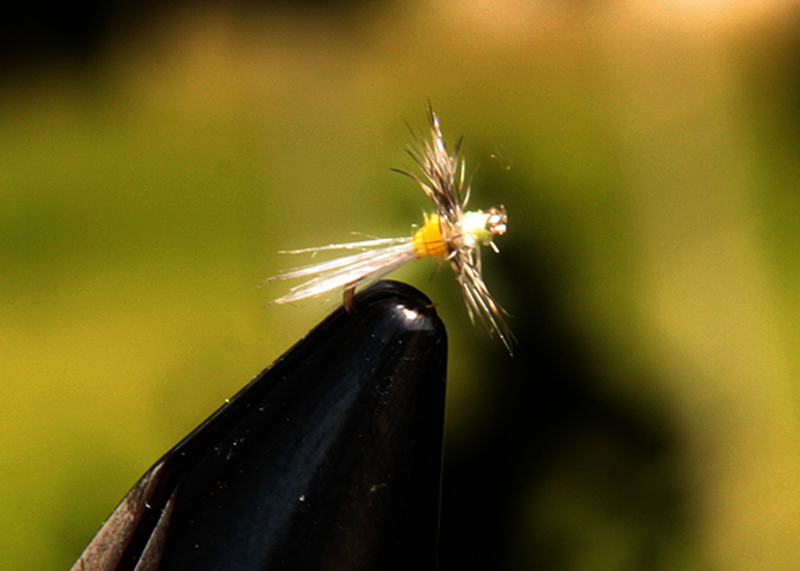 Anzuelo: 22. Hilo de montaje: amarillo huevo (muy fino). Cuerpo: solo dos o tres vueltas de sustituto de cóndor amarillo. Alas: dos puntas de pluma lo más clara posible posicionadas paralelas a la tija. Hackle: grizzly