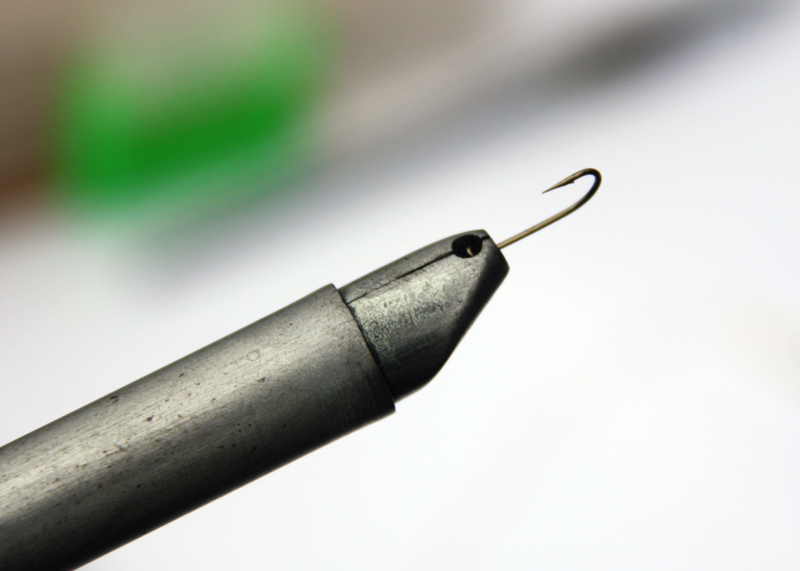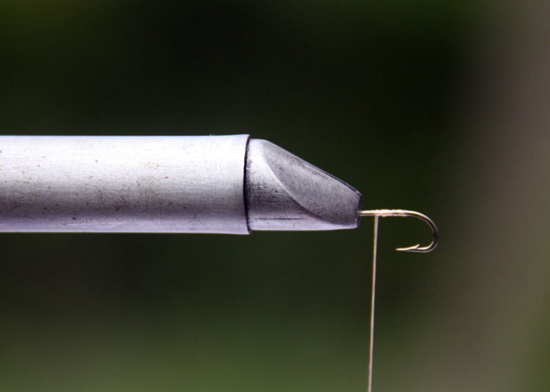 2.- Fijamos el anzuelo en el torno por la parte de la anilla o de la paleta en la zona taladrada, según el modelo de anzuelo que utilicemos para el montaje