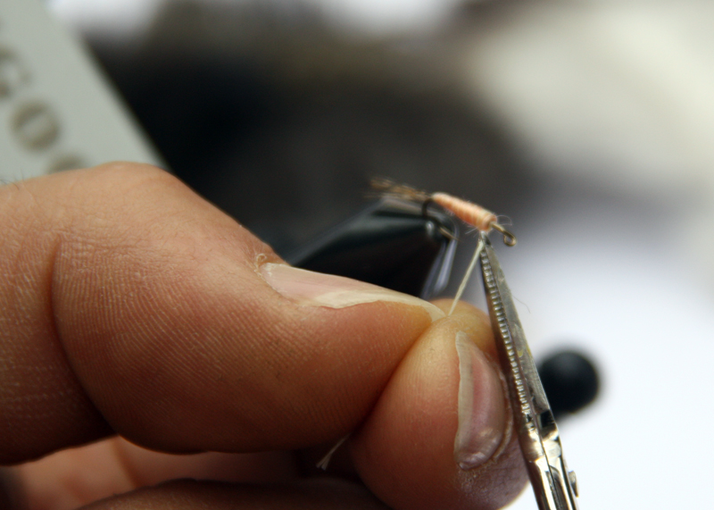 14.- Después de unas vueltas de hilo distribuimos la pluma alrededor del anzuelo, de manera adecuada, presionando y girando las fibras con la uña