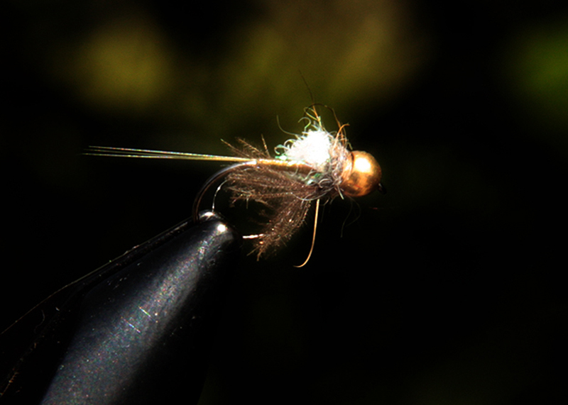 Anzuelo: 16. Bola: tungsteno plateada de 2,5. Cercos: fibras pardas de pluma de gallo de León. Tip: Tinsel holográfico rojo. Cuerpo: Body Quills negro. Torax: pavo verde. Brinca: tinsel redondo azulado.