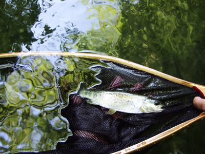 El uso de una sacadera de malla sin nudos acorta la pelea y permite manejar las truchas para devolverlas al río en óptimas condiciones